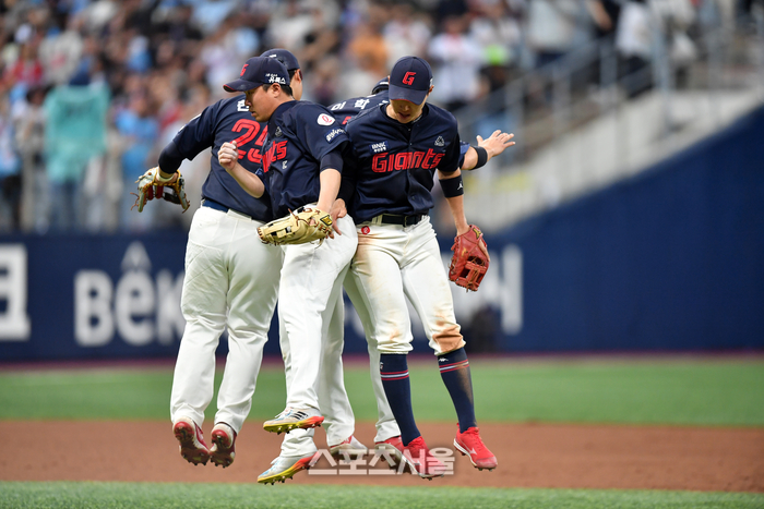 안치홍 등 롯데 내야수들이 27일 고척스카이돔에서 2023 프로야구 키움히어로즈와 롯데자이언츠의 경기에서 6-5로 승리한 후 자축하고 있다. 2023.05.27.