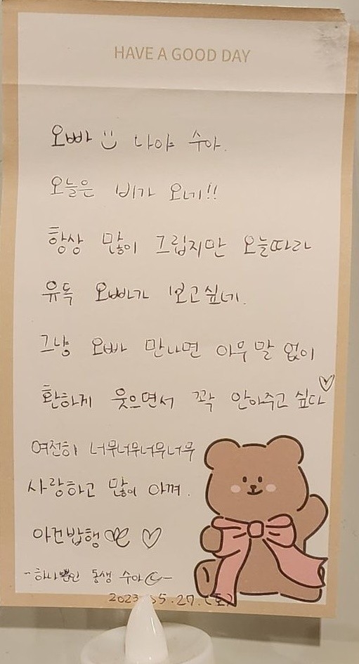 문수아는 27일 故문빈의 추모 공간을 방문, 오빠를 향한 애틋한 마음을 메시지로 남겼다. 문수아는 이 글에서 “오늘은 비가 오네! 항상 많이 그립지만 오늘따라 유독 오빠가 보고 싶네. 그냥 오빠 만나면 아무 말 없이 환하게 웃으면서 꽉 안아주고 싶다”고 적었다.
