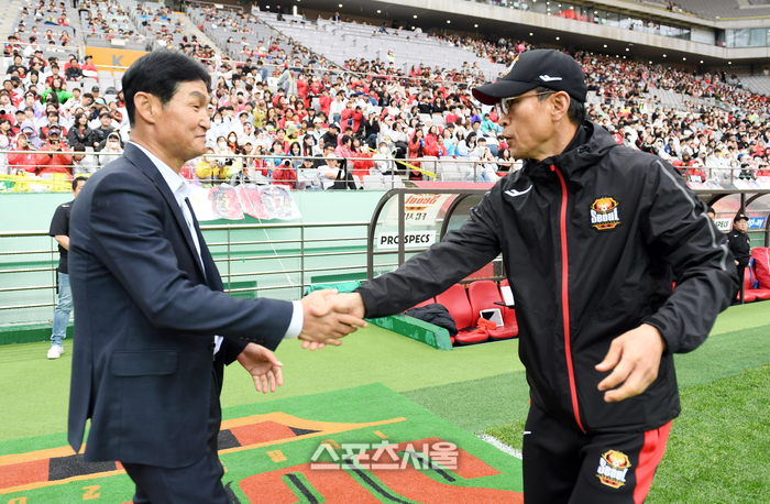 FC서울 안익수 감독(오른쪽)이 28일 서울월드컵경기장에서 열린 2023 하나원큐 K리그1 강원FC와 경기에 앞서 강원 최용수 감독과 인사를 나누고 있다. 2023. 5. 28.