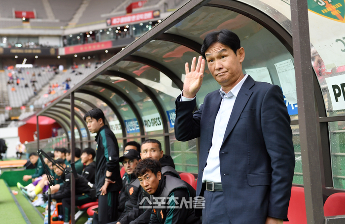 강원FC 최용수 감독이 28일 서울월드컵경기장에서 열린 2023 하나원큐 K리그1 FC서울과 경기에 앞서 FC서울 선수들의 인사에 손을 들어 화답하고 있다. 2023. 5. 28.