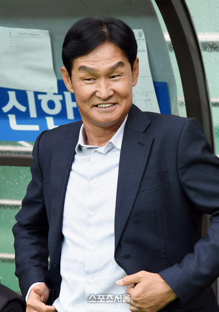 강원FC 최용수 감독이 28일 서울월드컵경기장에서 열린 2023 하나원큐 K리그1 FC서울과 경기에 앞서 코칭스태프와 이야기를 나누며 웃음을 짓고 있다. 2023. 5. 28.