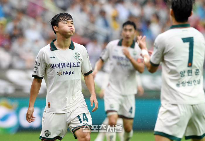 강원FC 김대우(왼쪽)가 28일 서울월드컵경기장에서 열린 2023 하나원큐 K리그1 FC서울과 경기에서 골문을 벗어난 슛에 아쉬워하고 있다. 2023. 5. 28.