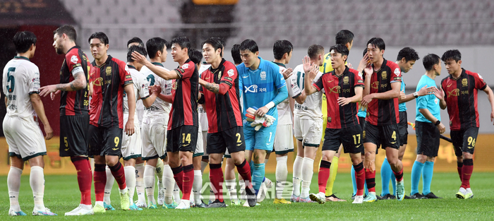 FC서울 선수들이 28일 서울월드컵경기장에서 열린 2023 하나원큐 K리그1 강원FC와 경기에서 1-0으로 승리한 뒤 상대 선수들과 하이파이브를 하고 있다. 2023. 5. 28.