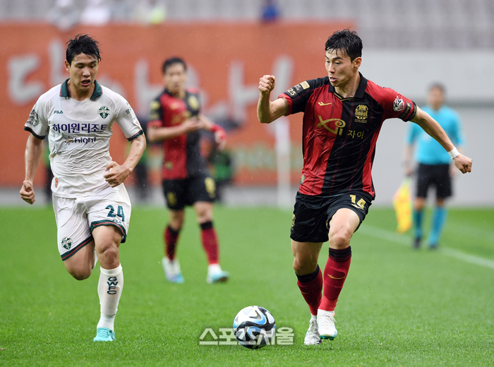 FC서울 임상협(오른쪽)이 28일 서울월드컵경기장에서 열린 2023 하나원큐 K리그1 강원FC와 경기에서 강원 김진호의 수비를 피해 드리블을 하고 있다. 2023. 5. 28.