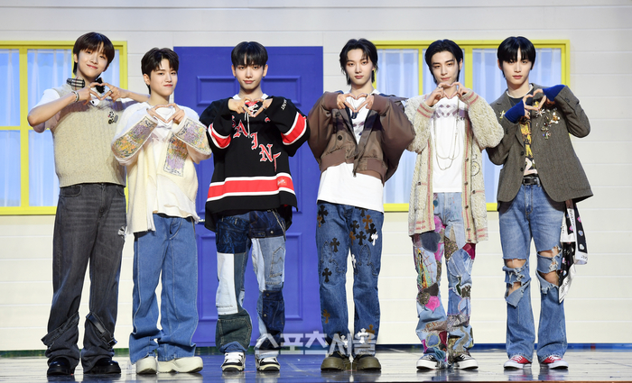 보이넥스트도어(BOYNEXTDOOR)가 30일 서울 용산구 블루스퀘어에서 진행된 데뷔 싱글 앨범 ‘WHO!’ 미디어 쇼케이스에서 취재진을 향해 포즈를 취하고 있다. 왼쪽부터 운학, 리우, 명재현, 성호, 이한, 태산.
