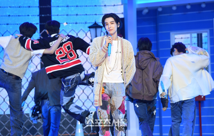보이넥스트도어(BOYNEXTDOOR)의 이한이 30일 서울 용산구 블루스퀘어에서 진행된 데뷔 싱글 앨범 ‘WHO!’ 미디어 쇼케이스에서 열정적인 무대를 선보이고 있다.