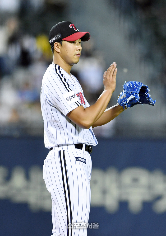 LG 정우영이 30일 잠실구장에서 열린 2023 KBO리그 롯데와 경기 8회초 무사 1루 롯데 안권수의 병살타 때 더블 플레이를 쳐리한 내야수들에게 박수를 보내고 있다. 2023. 5. 30.
