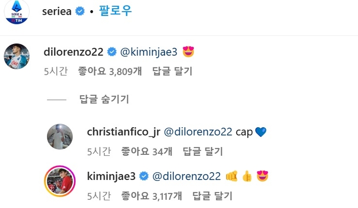 둘은 세리에A 소셜 미디어에서 훈훈한 댓글을 남겨 눈길을 끌었다. 디 로렌초가 먼저 김민재의 계정을 태그한 뒤 하트 이모티콘을 남겼다. 그러자 김민재도 곧바로 댓글에 ‘엄지 척’, ‘하트’ 이모티콘을 달며 ‘네가 최고’라는 의미를 남겼다. 서로서로 지지하는 모습이었다.