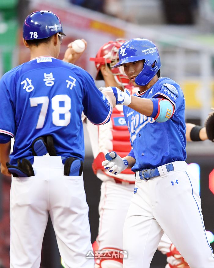 삼성 라이온즈 이재현이 31일 인천 SSG랜더스필드에서 열린 2023 KBO리그 SSG 랜더스와 경기 4회초 1사 SSG 선발 엘리아스를 상대로 솔로 홈런을 친 뒤 강봉규 코치와 하이파이브를 하고 있다. 2023. 5. 31. 문학 | 박진업기자 upandup@sportsseoul.com