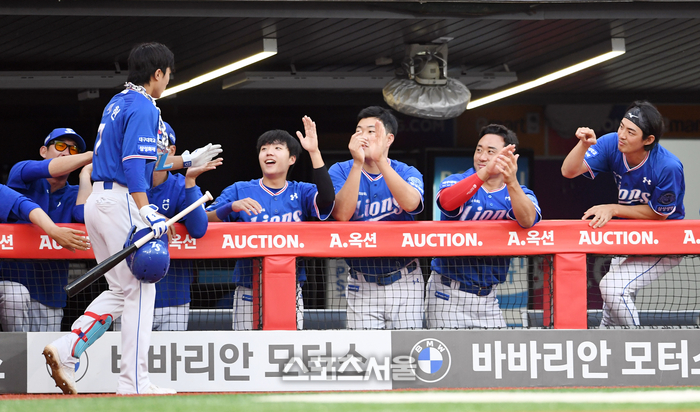 삼성 라이온즈 이재현이 31일 인천 SSG랜더스필드에서 열린 2023 KBO리그 SSG 랜더스와 경기 4회초 1사 SSG 선발 엘리아스를 상대로 솔로 홈런을 친 뒤 동료들의 축하를 받고 있다. 2023. 5. 31. 문학 | 박진업기자 upandup@sportsseoul.com