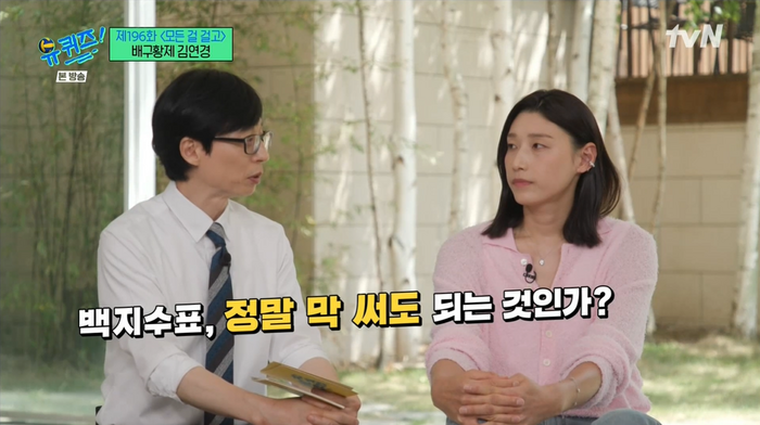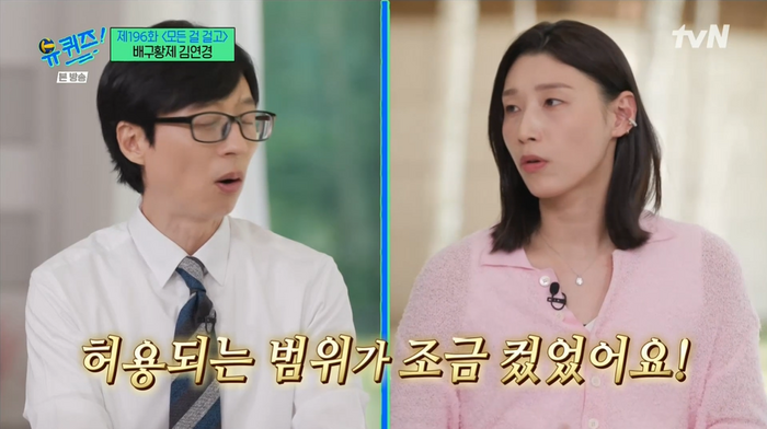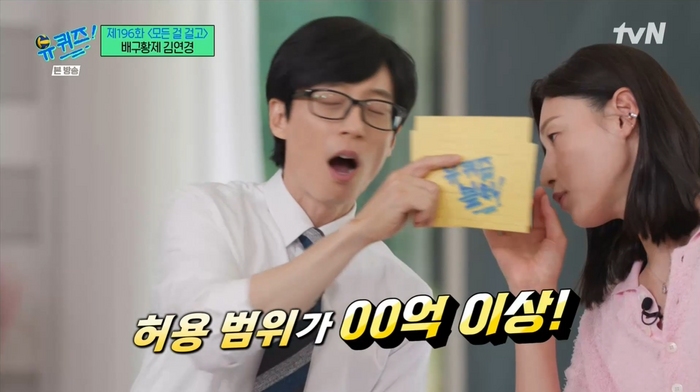 유재석은 “그럼 백지 수표에 써도 되는 허용 범위가 어느 정도인가”라고 물었다. 김연경은 “허용되는 범위가 컸었다”라고 답했다. 이어서 금액을 물어보는 유재석에게 귓속말로 전했다. 자막으로는 ‘○○억 이상’이라고 나와 시선을 모았다.