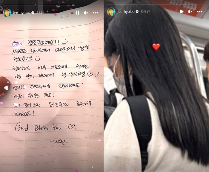 공개된 사진 속 이효리는 지하철에서 우연히 한 팬을 만났다. 팬은 손편지를 건냈고, 이에 이효리가 하트 이모티콘으로 답변했다.