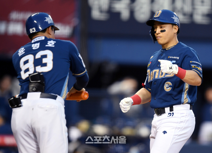 NC 손아섭이 2일 잠실야구장에서 열린 2023 KBO리그 LG와 경기 5회초 1사2루 우월홈런을 날린 후 윤병호 코치와 하이파이브를 하고 있다. 2023. 6. 2. 잠실 | 최승섭기자 thunder@sportsseoul.com