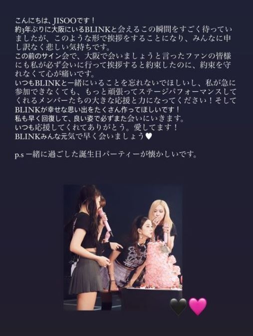 끝으로 지수는 “저도 빨리 회복해서 좋은 모습으로 꼭 다시 만나러 가겠다. 항상 응원해 줘서 고맙다. 사랑해요 블링크. 모두 잘 지내고 빨리 만나요... P.S 함께 보낸 생일 파티가 그립다”라는 말을 남겼다.