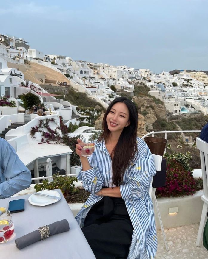 한예슬은 그리스 산토리니의 한 야외 테이블에서 휴가를 보내고 있다. 스트라이프 셔츠를 입고 미소를 짓고 있다. 청순한 느낌을 뽐낸 그는 한 손에는 유리잔을 들고 있다.