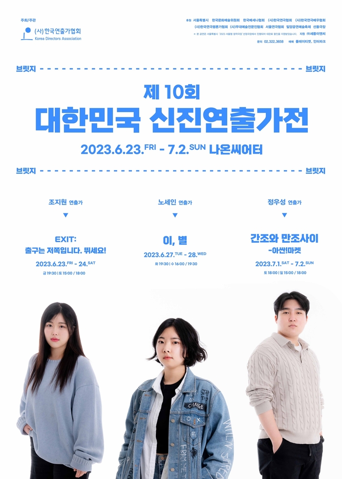 ‘브릿지 페스타’는 30세 미만의 연출자 혹은 조연출자들을 선정해 실험적인 연출 기회를 제공한다. 올해 ‘EXIT : 출구는 저쪽입니다. 뛰세요!’(조지원 연출), ‘이, 별’(노세인 연출), ‘간조와 만조사이 – 아싼!마켓’(정우성 연출) 등 3편이 선정됐다.