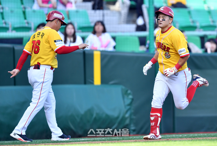 SSG 2번타자 최주환이 4일 2023 프로야구 SSG랜더스와 키움히어로즈의 경기 3회말 선두타자로 나와 장재영을 상대로 우월솔로홈런을 터트린 후 홈인하고 있다.. 2023.06.04.