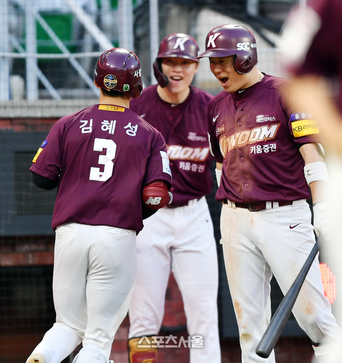 키움 5번타자 김혜성이 4일 2023 프로야구 SSG랜더스와 키움히어로즈의 경기 8회초 1사후 역전 솔로홈런을 터트리며 홈인하고 있다. 2023.06.04.