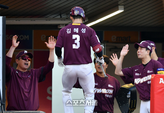 키움 5번타자 김혜성이 4일 2023 프로야구 SSG랜더스와 키움히어로즈의 경기 8회초 1사후 역전 솔로홈런을 터트리며 홈인하고 있다.측하하는 홍원기 감독. 2023.06.04.