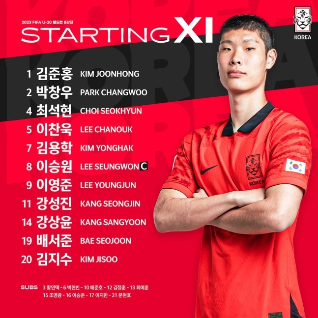 한국은 최전방에 이영준을 배치하고 좌우에 김용학과 강성진을 세운다. 이승원과 강상윤, 이찬욱이 허리를 지키고, 배서준과 김지수, 최석현, 박창우가 포백을 구성한다. 주전 골키퍼는 김준홍이다.