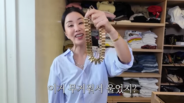 4단 서랍장을 빼곡히 채울 만큼 목걸이와 귀걸이를 가지고 있는 엄정화는 화려하고 큰 금색 목걸이를 보여줬다.