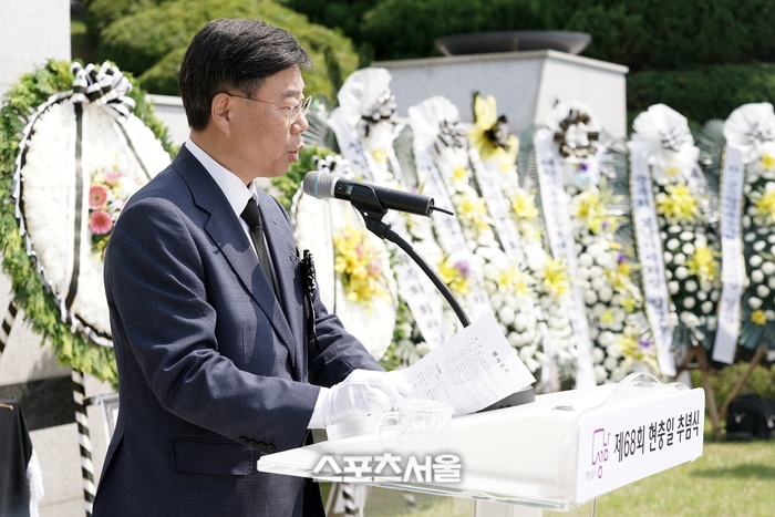 〔스포츠서울│성남=좌승훈기자〕신상진 성남시장은 6일 수정구 태평4동 현충탑에서 열린 ‘제68회 현충일 추념식’에서 “오늘날 우리가 누리는 자유와 번영은 조국을 위해 온몸을 던지신 순국선열과 호국영령들이 없었다면 불가능했음을 잘 알고 있다”면서 “개인의 일신과 평안보다 나라를 위해 목숨까지 바치신 호국영령들의 영전에 삼가 머리 숙여 애도를 표하고 사랑하는 가족을 떠나보내야 했던 유가족 여러분께는 위로의 말씀을 드린다”고 말했다.