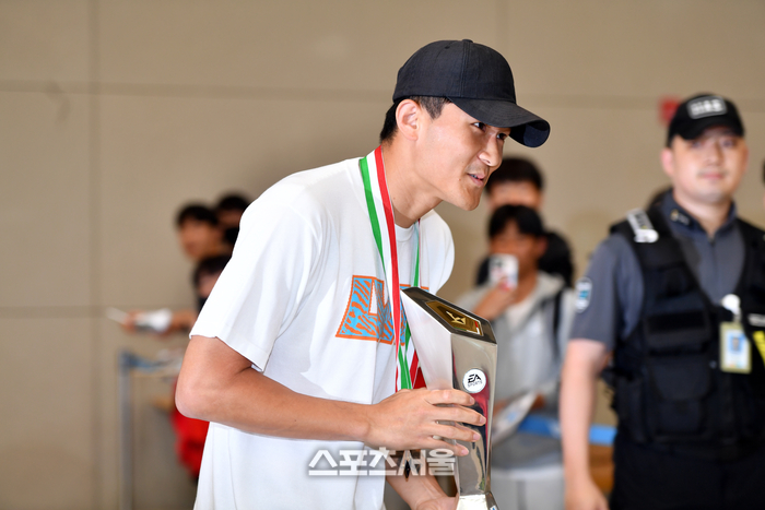 세리에A 수비왕 김민재가 현충일인 6일 인천공항을 통해 귀국했다. 군사훈련으로 대표팀 A매치 일정에 참여하지 못하는 김민재가 2022-23세리에A 최우수 수비상 트로피를 들고 입국장을 빠져나오며 미소짓고 있다. 2023.06.06.