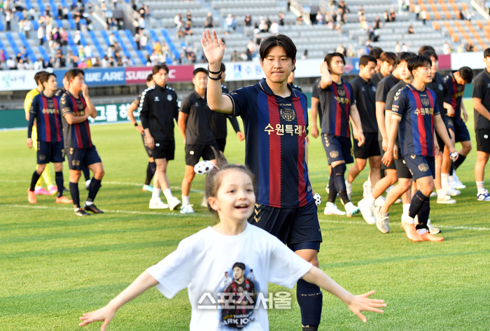 은퇴하는 박주호가 6일 하나원큐 K리그 2023 17라운드 울산현대와 수원FC경기를 마친 후 그라운드를 돌며 선수로서 마지막으로 팬들을 만나고 있다.2023.06.06.