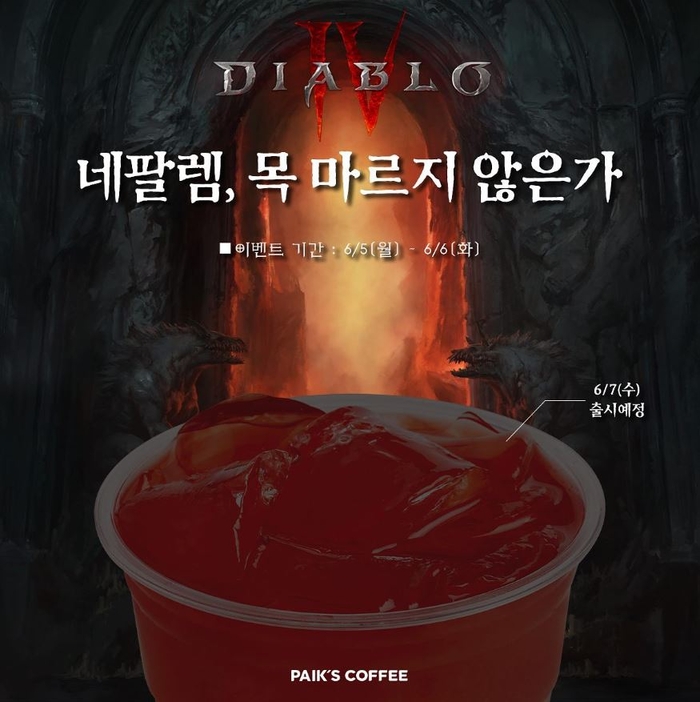 해당 홍보 게시물에는 “네팔렘, 목마르지 않은가”라는 문구가 적혀 있어 눈길을 끌었다. 네팔렘은 ‘디아블로 시리즈’에 등장하는 종족을 의미한다.