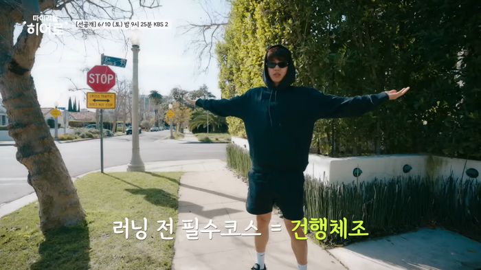 임영웅은 이른 아침 러닝을 뛰기 위해 나왔다. 러닝을 뛰기 전 스트레칭을 하던 그는 ‘건행체조’를 하며 몸을 푸는 모습을 보였다.