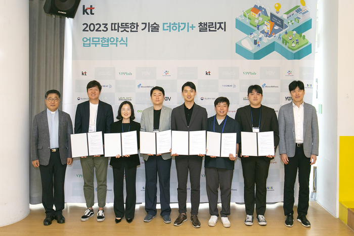 [스포츠서울 | 황철훈기자] KT는 한국사회가치연대기금, 임팩트스퀘어와 ‘2023년 KT 따뜻한 기술 더하기 챌린지’ 지원 기업 6곳을 선발하고 해당 기업과 업무협약을 체결했다고 7일 밝혔다.