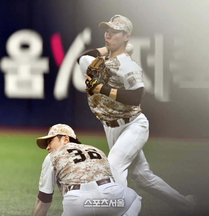 키움 2루수 김성이 7일 고척스카이돔에서 열린 2023 프로야구 키움히어로즈와 LG트윈스의 경기 2회초 무사 만루 김민성의 플라이를 잡아낸 후 내야로 송구하고 있다.2023.06.07.