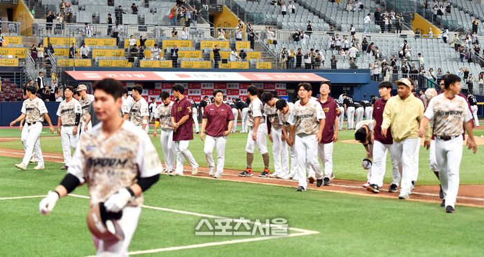 키움 선수들이 7일 고척스카이돔에서 열린 2023 프로야구 키움히어로즈와 LG트윈스의 경기 12회말 마지막 공격에서 만루찬스를 살리지 못하며 경기를 끝내고 있다. 2023.06.07.