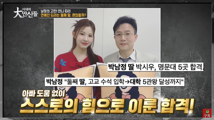 박남정은 시우에 대한 고민을 이어갔다. “둘째가 아빠와 언니에 대한 외부 사람들의 눈빛에 트라우마가 있었다. 그래서 자기가 혼자 이를 악물고 공부해서 대학교 5곳을 동시에 합격했다. 자기가 원하는 대학교로 들어갔다. 하지만 ‘난 뭐든 다 할 수 있어’라는 자신감, 꿈만 꿀까 봐 불안하다”라고 말했다.