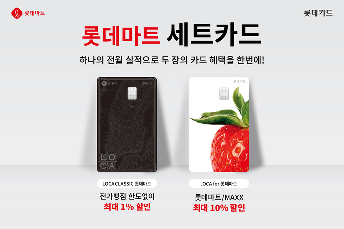롯데카드는 롯데마트와 함께 PLCC(상업자 표시 신용카드) 상품인 ‘롯데마트 세트카드’를 선보였다. 롯데마트 세트카드는 ‘로카 클래식 롯데마트’ 카드와 ‘로카 포 롯데마트’ 카드 2종이다.