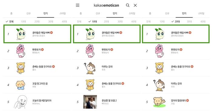 ‘쿵야들은 매일 바뻐’ 이모티콘은 총 32종으로 구성, ‘쿵야 레스토랑즈’의 인기 캐릭터 양파쿵야와 주먹밥쿵야의 재치 있는 멘트를 담고 있다. 지난 7일 출시 직후 ‘많이 선물하는 이모티콘’ 카테고리 1위를 달성한데 이어 하루 만에 전체 인기 순위에서 1위에 올랐다. 연령별 인기 순위에선 10대와 20대 소비자들로부터 가장 많은 선택을 받았다.