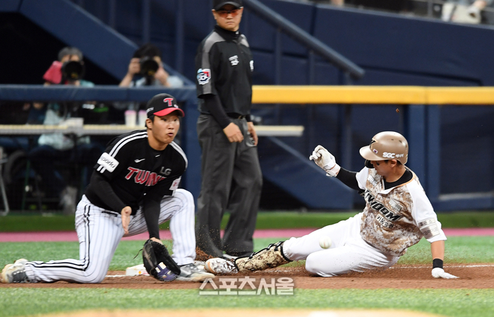 키움 히어로즈 이정후(오른쪽)가 8일 고척스카이돔에서 열린 2023 KBO리그 LG 트윈스와 경기 4회말 2사 1루 상황에서 LG 선발 김윤식을 상대로 1타점 3루타를 치고 베이스를 향해 슬라이딩을 하고 있다. 1회말 2타점 2루타에 이어 이정후의 경기 멀티 히트로 3타점. 2023. 6. 8. 고척| 박진업기자 upandup@sportsseoul.com