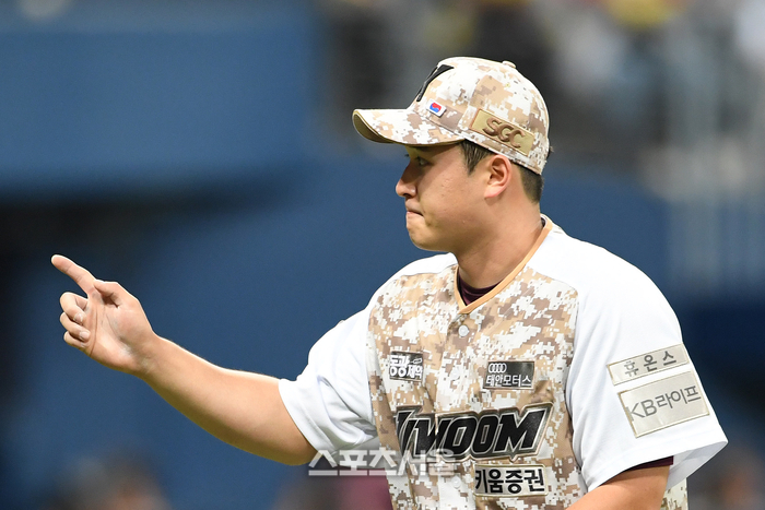 키움 히어로즈 선발투수 최원태가 8일 고척스카이돔에서 열린 2023 KBO리그 LG 트윈스와 경기 5회초 2사 1-3루 상황에서 LG 홍창기를 땅볼로 잡아내며 이닝을 막아낸 뒤 포수를 가리키고 있다. 2023. 6. 8. 고척| 박진업기자 upandup@sportsseoul.com
