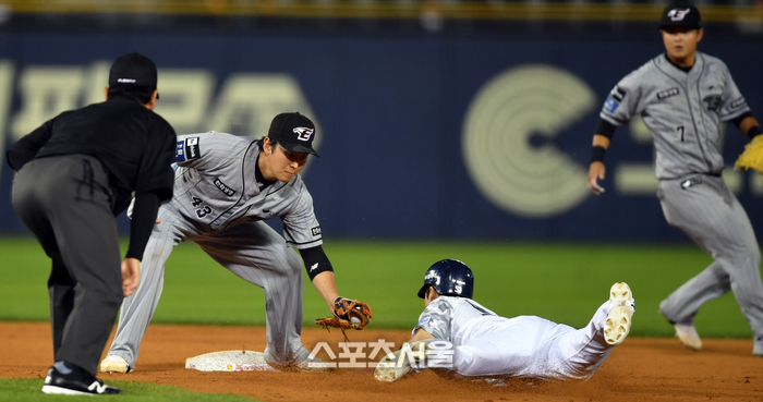 한화 2루수 정은원이 8일 잠실구장에서 열린 2023 프로야구 두산베어스와 한화이글스의 경기 7회말 1사 1루 이유찬 타석때 김재호 대주자 조수행이 2루도루를 시도하자 태그아웃시키고 있다. 2023.06.08.