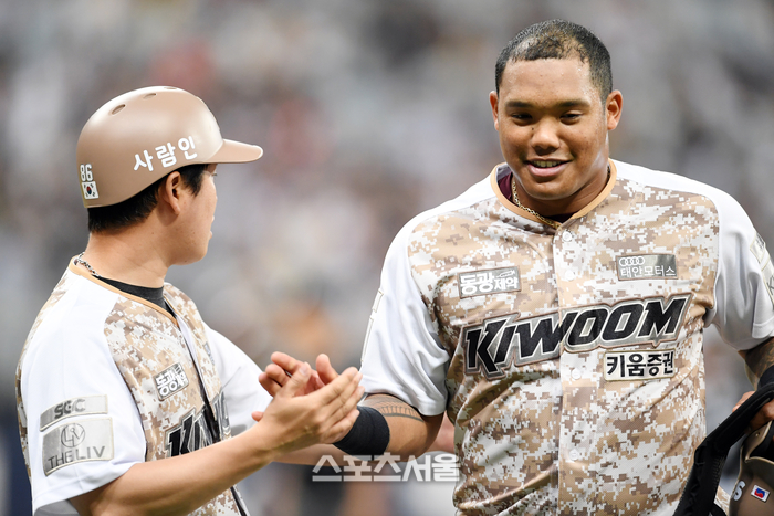 키움 히어로즈 러셀이 8일 고척스카이돔에서 열린 2023 KBO리그 LG 트윈스와 경기 6회말 1사 1-2루 상황에서 대주자로 교체되면서 밝게 웃으며 김지수 코치와 하이파이브를 하고 있다. 러셀은 6회까지 4안타를 몰아치며 KBO 리그 데뷔 첫 4안타 경기를 기록했다. 2023. 6. 8. 고척| 박진업기자 upandup@sportsseoul.com