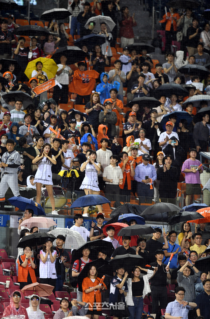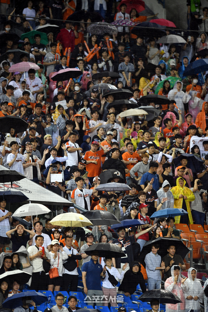 한화팬들이 8일 잠실구장에서 열린 2023 프로야구 두산베어스와 한화이글스의 경기 9회초 무사 만루찬스에서 비가 쏟아졌지만 자리를 지키며 응원하고 있다. 2023.06.08.