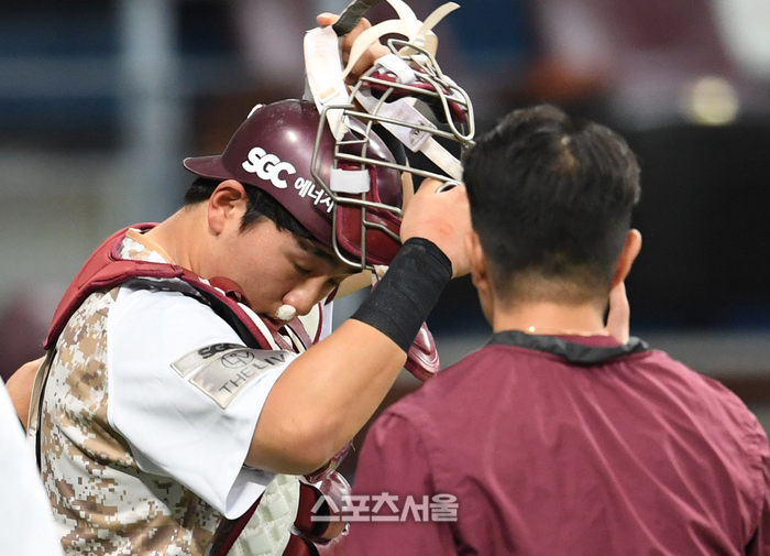 키움 히어로즈 포수 김동헌이 8일 고척스카이돔에서 열린 2023 KBO리그 LG 트윈스와 경기 9회초 수비를 하기 전 코피가 나 응급 처치를 하고 마스크를 쓰고 있다. 2023. 6. 8. 고척| 박진업기자 upandup@sportsseoul.com