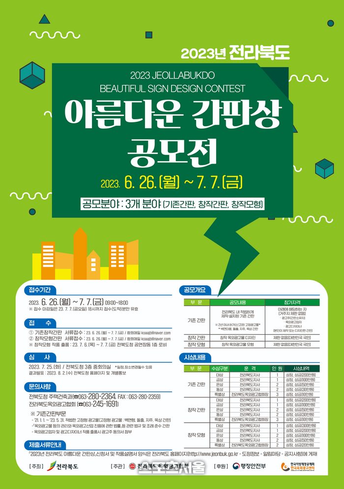 접수는 기존 우편 및 방문 접수 방식의 불편함을 해소하기 위해 올해부터 이메일(전북옥외광고협회 koaajb@naver.com)을 통해서도 가능하도록 변경했다. 다만, 창작모형 분야는 실물 모형을 직접 제출해야 한다.