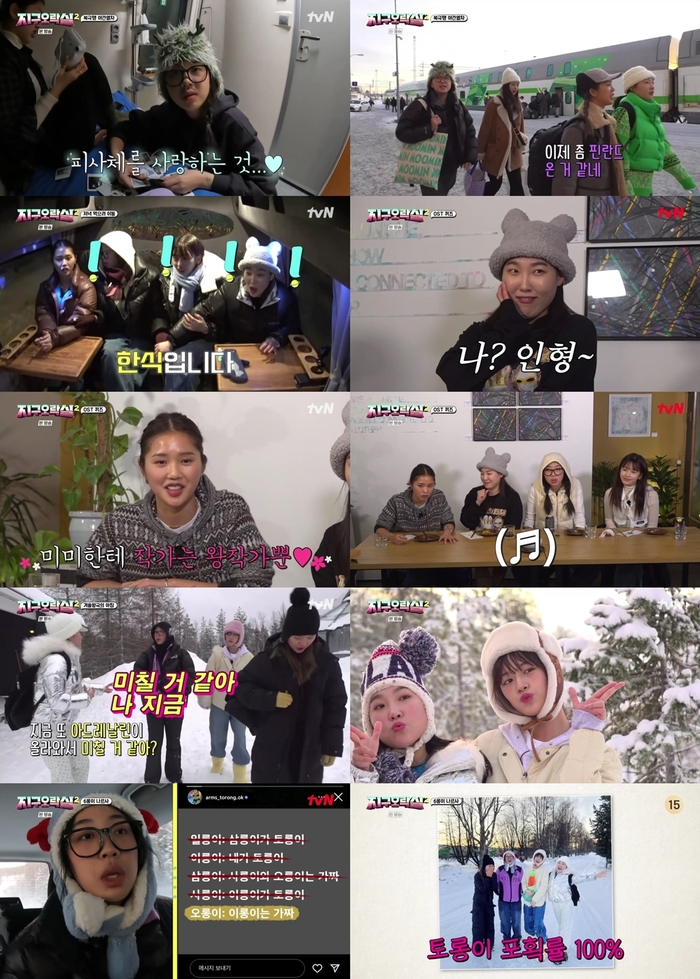 앞서 이은지, 미미, 이영지, 안유진은 헬싱키에서 야간열차를 타고 핀란드 두 번째 여행지를 향해 달려갔다. 이들은 핀란드에서 토롱이와 첫 추격전을 벌였다.