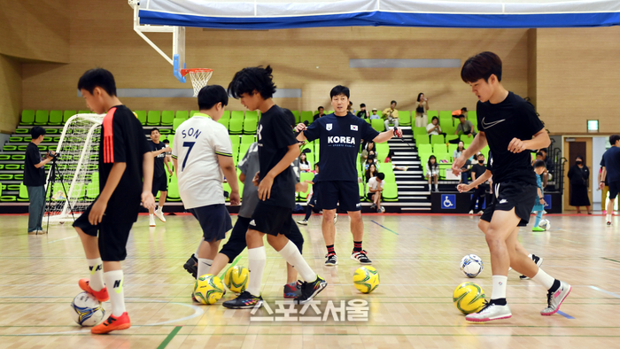 전 축구국가대표 송종국이 10일 세종 정부종합청사체육관에서 열린 국가대표 스포츠 클럽 행사에서 참가자에 드리블 방법을 강의하고 있다. 2023. 6. 10. 세종 | 최승섭기자 thunder@sportsseoul.com