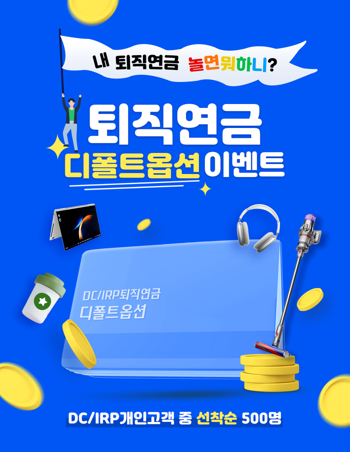 이번 이벤트는 디폴트옵션 상품(초저위험 제외)을 기준금액 이상 매수한 고객 중 선착순 500명에게 △삼성 갤럭시북3 프로(1명) △Apple 에어팟 맥스(1명) △다이슨 디지털 슬림 청소기(1명) △스타벅스 기프티콘(497명) 등의 상품을 제공한다. 디폴트옵션이란 근로자가 운용하는 원리금 보장 상품의 만기가 되면 별도의 상품을 선택하지 않아도 사전에 내가 지정해놓은 디폴트옵션 상품으로 적립금을 자동으로 운용하는 제도다.