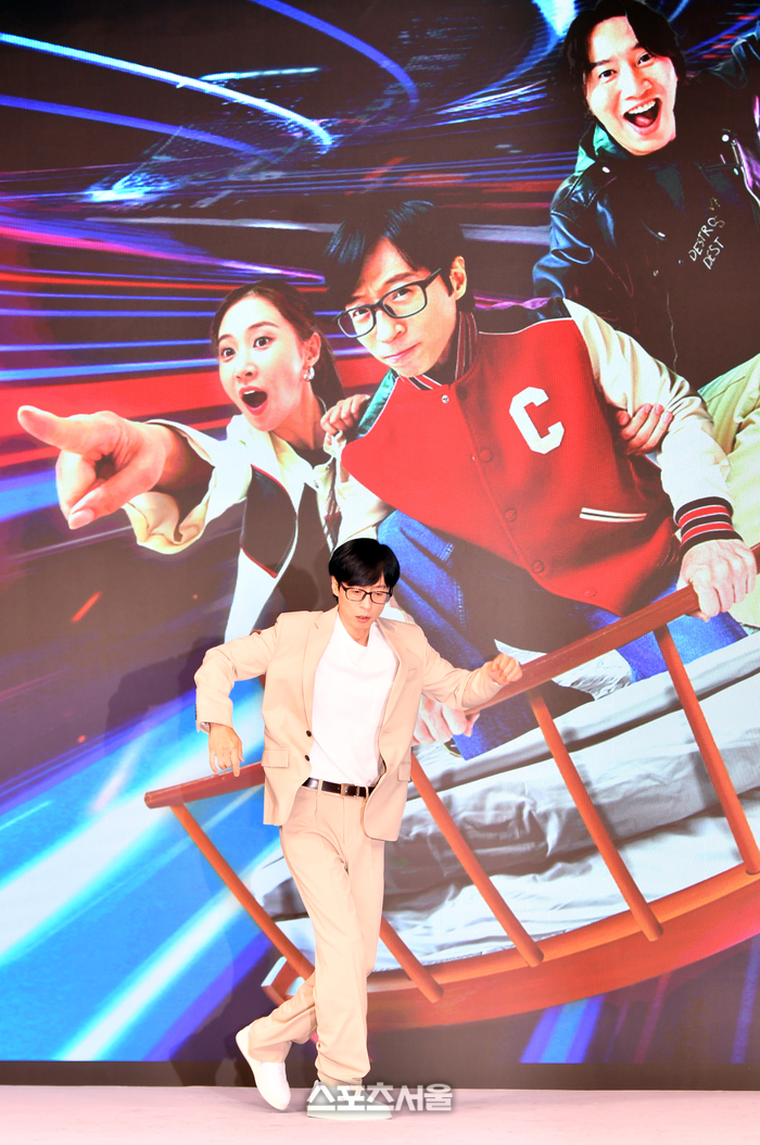 유재석이 13일 JW매리어트 동대문스퀘어에서 열린 디즈니플러스 새 예능 ‘더 존: 버텨야 산다2’ 제작발표회 무대에 올라 포토타임을 갖고 있다. 박경림의 요청으로 색다른 댄스타임이 진행되고 있어 눈길을 끈다. 2023.06.13.