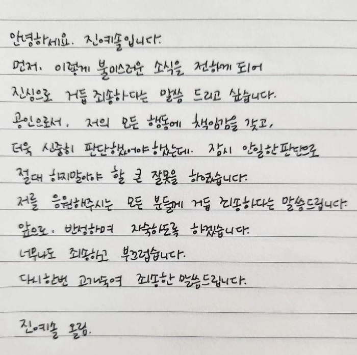 진예솔은 “이렇게 불미스러운 소식을 전하게 되어 진심으로 거듭 죄송하다는 말씀드리고 싶습니다”라며 “공인으로서 저의 모든 행동에 책임감을 갖고 더욱 신중히 판단했어야 했는데 잠시 안일한 판단으로 절대 하지 말아야 할 큰 잘못을 하였습니다”라고 전했다.