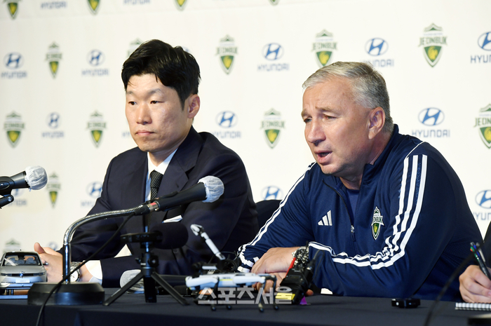 루마니아 출신의 단 페트레스쿠 감독(오른쪽)이 14일 경기도 고양시 현대모터스튜디오에서 진행된 전북현대 제 7대 감독 선임 기자회견에서 박지성 테크니컬 디렉터와 함께 취재진의 질문에 답을 하고 있다. 2023. 6. 14. 고양 | 박진업기자 upandup@sportssseoul.com