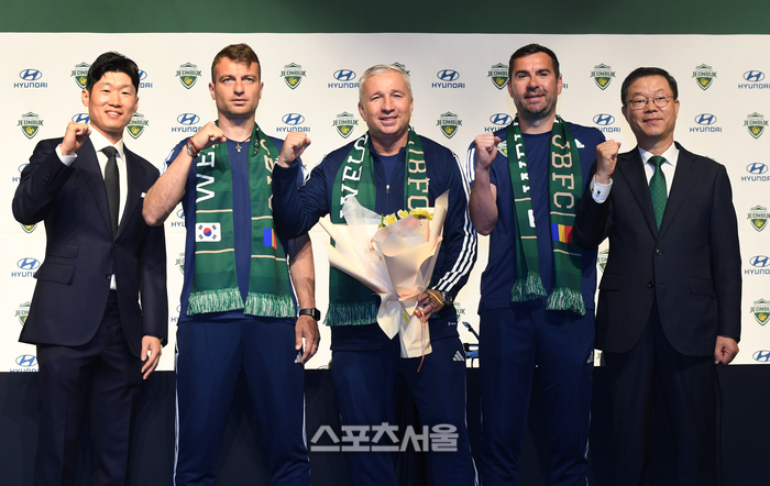 14일 경기도 고양시 현대모터스튜디오에서 진행된 전북현대 제 7대 감독 선임 기자회견에서 참석자들이 기념촬영을 하고 있다. 왼쪽부터 박지성 테크니컬 디렉터, 보그단 알데아 피지컬 코치, 단 페트레스쿠 감독, 발레이루 보르데아누 수석코치, 전북현대 허병길 대표이사. 2023. 6. 14. 고양 | 박진업기자 upandup@sportssseoul.com
